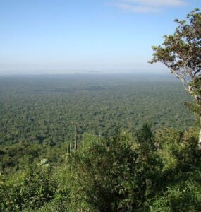 A floresta estacional semidecidual é interiorana e se distribui principalmente sobre planaltos, em altitudes de 700 m a 1.000 m acima do nível do mar Vista aérea de floresta estacional semidecidual no Parque Estadual...